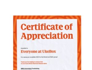 During the last months UKeBox have been raising money from their concerts and have now donated the impressive sum of £505 to the Motor Neurone